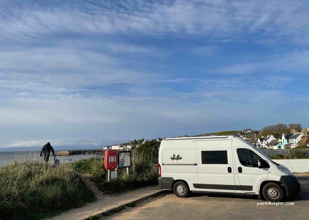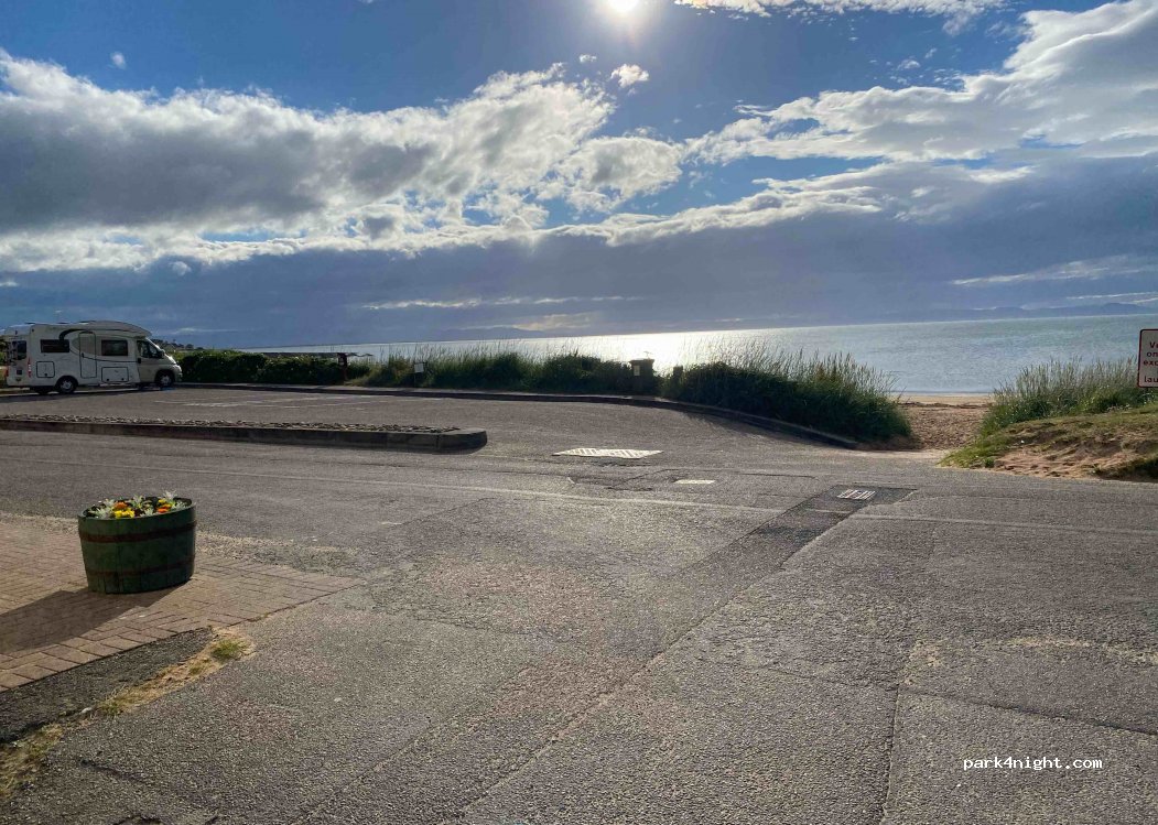 One of two small car parks on Main Street right at the beach. Lovely beach with great views across the Firth. Public toilets a few mins mins walk away. Clean and well looked after. Good walk for dogs along coast, if you fancy a longer walk continue along route to Tarbet Ness Lighthouse. Local shop and fancy restaurant nearby. Spent one night here as a stopover. We put a donation in the box provided. Recommend!!