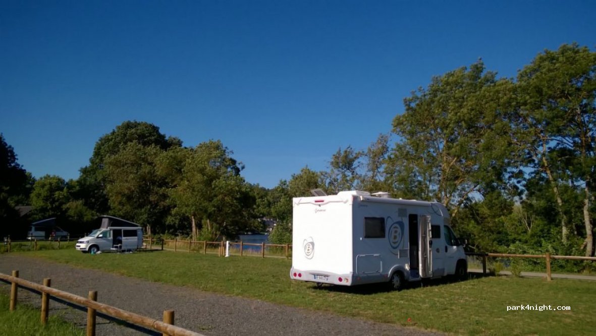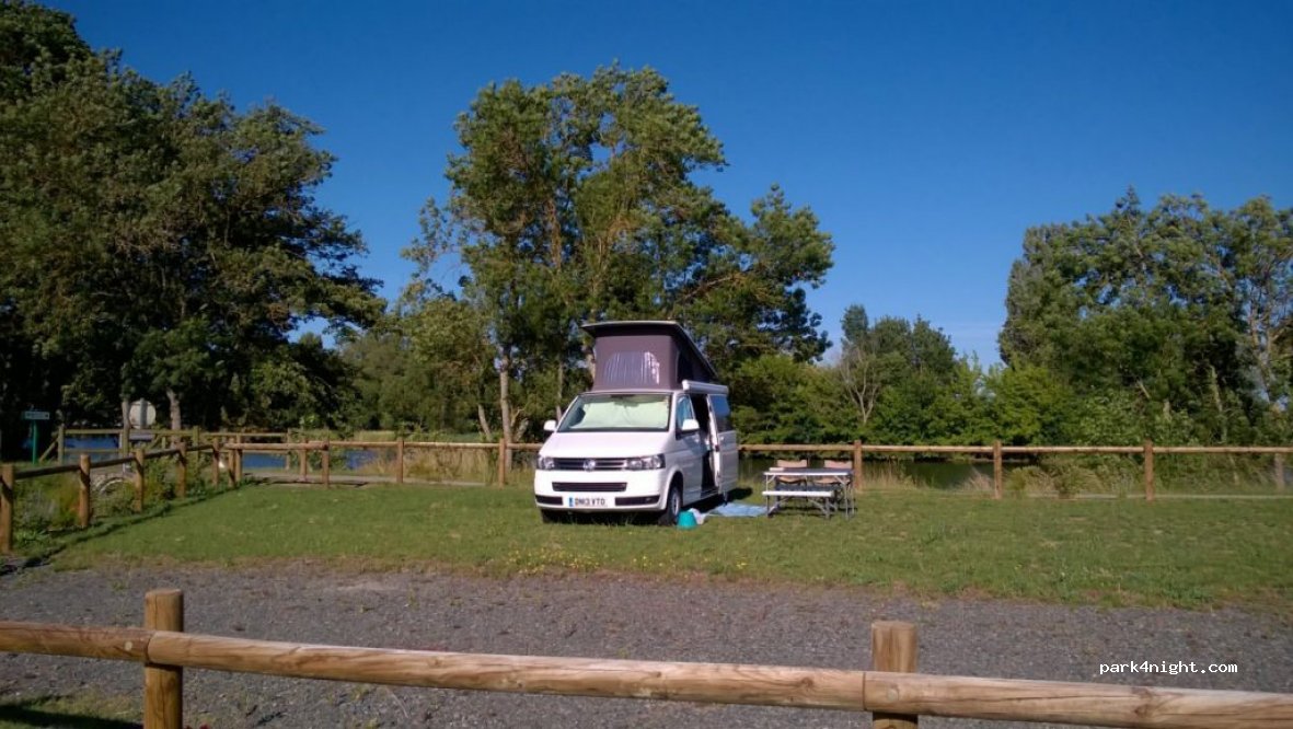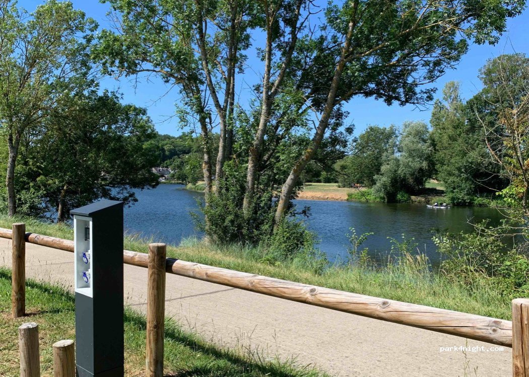 Joli parking pour passer la nuit, emplacement enherbé et délimité, bien grand avec possibilité de sortir table et chaises. Branchement électrique.Au bord de l’eau, à côté d’une piste cyclable. Une route passe le long du parking mais très très peu de circulation. Endroit très calme et tranquille. Les services d’eau se font à l’extérieur du parking à l’entrée du camping voisin. Un charmant village