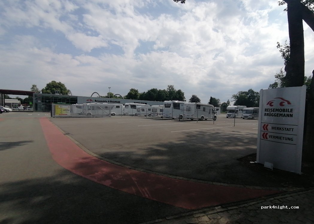 Kostenloser Stellplatz auch für lange Wohnmobile geeignet. Geteer und gerade. Vor dem Tor zu Reisemobile Brüggemann auf der Seite zum Shop-Eingang. Immer zugänglich und kostenloser Strom. Tagsüber Betrieb, da in einem Miniindustriegebiet, nachts ruhig. Gasflaschen während der Shopöffnung erhältlich.