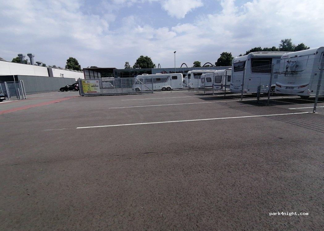 Posto auto gratuito adatto anche ai campeggiatori di lunga sosta. catrame e dritto. Di fronte alla porta della Reisemobile Brüggemann sul lato dell'ingresso del negozio. Elettricità sempre accessibile e gratuita. Occupato di giorno in quanto si trova in una mini zona industriale, tranquilla di notte. Bombole del gas disponibili all'apertura del negozio. Posizione più tranquilla rispetto al posto auto direttamente sulla strada con smaltimento.