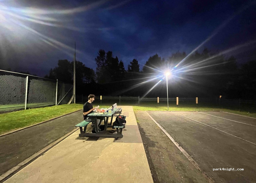 Der Parkplatz ist riesig und verlassen, sehr ruhig und schwach beleuchtet. Andererseits keine Toiletten und der morgendliche Weckruf um 8 Uhr, der von der benachbarten Schule auferlegt wird.