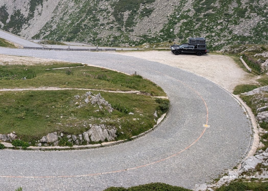 Gelände ist leicht abschüssig, ansonsten schöner kleiner Parkplatz. Da direkt an der Passstrasse muss natürlich auch nachts mit Fahrzeugen gerechnet werden, in meiner Nacht war aber ruhig. Wunderschöne Aussicht auf die alte Passstrasse, oberhalb ein Plateau welches zum Wandern geeignet ist. Natürlich muss man autark sein.