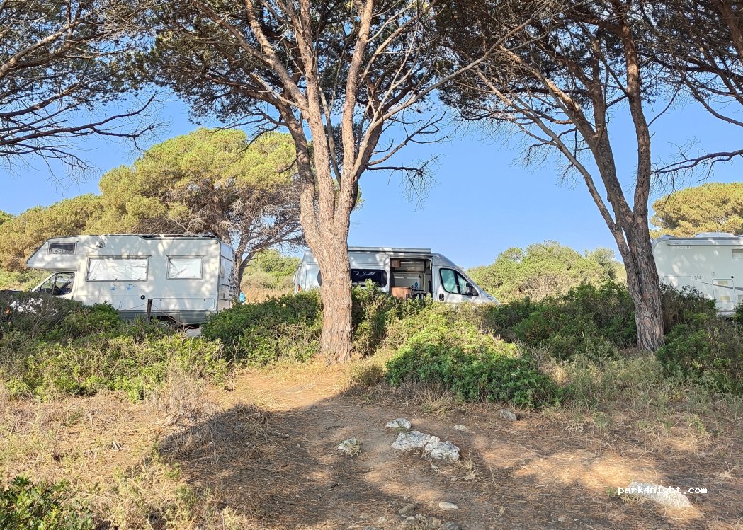 Toller Platz direkt zwischen den Pinienbäumen am Meer. 5min entfernt ist ein schönes Restaurant und eine Außendusche. Wir haben dort zwei Nächte total ruhig verbracht. Die Polizei ist 1-2 mal am Tag vorbeigekommen, aber hat nichts gesagt.