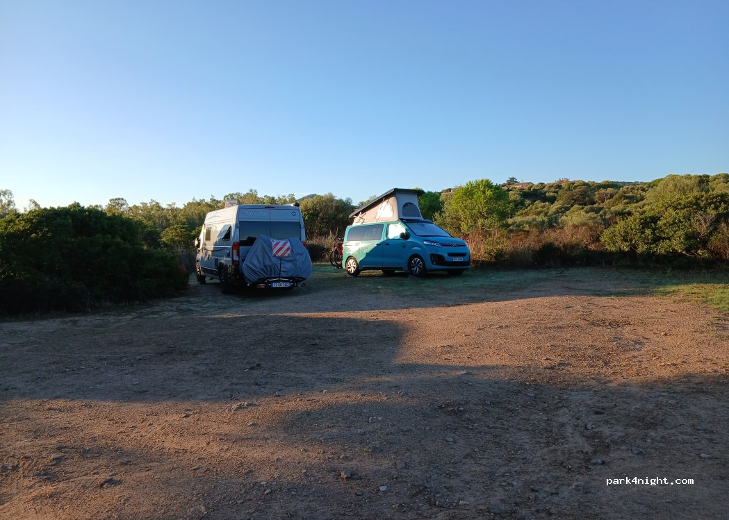 Wat een droom plek! Schaduwrijk. Goed toegankelijk via onverharde weg. Genoeg plaatsen. Erg stil. Geen voorzieningen. Vuilnis dus meenemen! Hou deze plaats ajb schoon en netjes. Te voet ( ca 10 minuten ) zijn beide strandjes en restaurantjes makkelijk te bereiken. In restaurant Shardana kan je heel lekker eten evenals in beachbar Miramar.