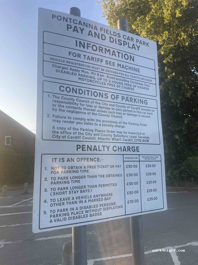 Handy for Principality Stadium, short walk or cycle through Park. Chargeable Monday/Friday 8am-6pm £5 for day, free at weekends. Easily pay on the mipermit, Stayed 3 nights to ensure we had a space in time for a gig at the Stadium but on the morning was nearly empty so we not a problem. fills up in evening due to cricket training on the fields, park only in marked bays or get a fine No facilities