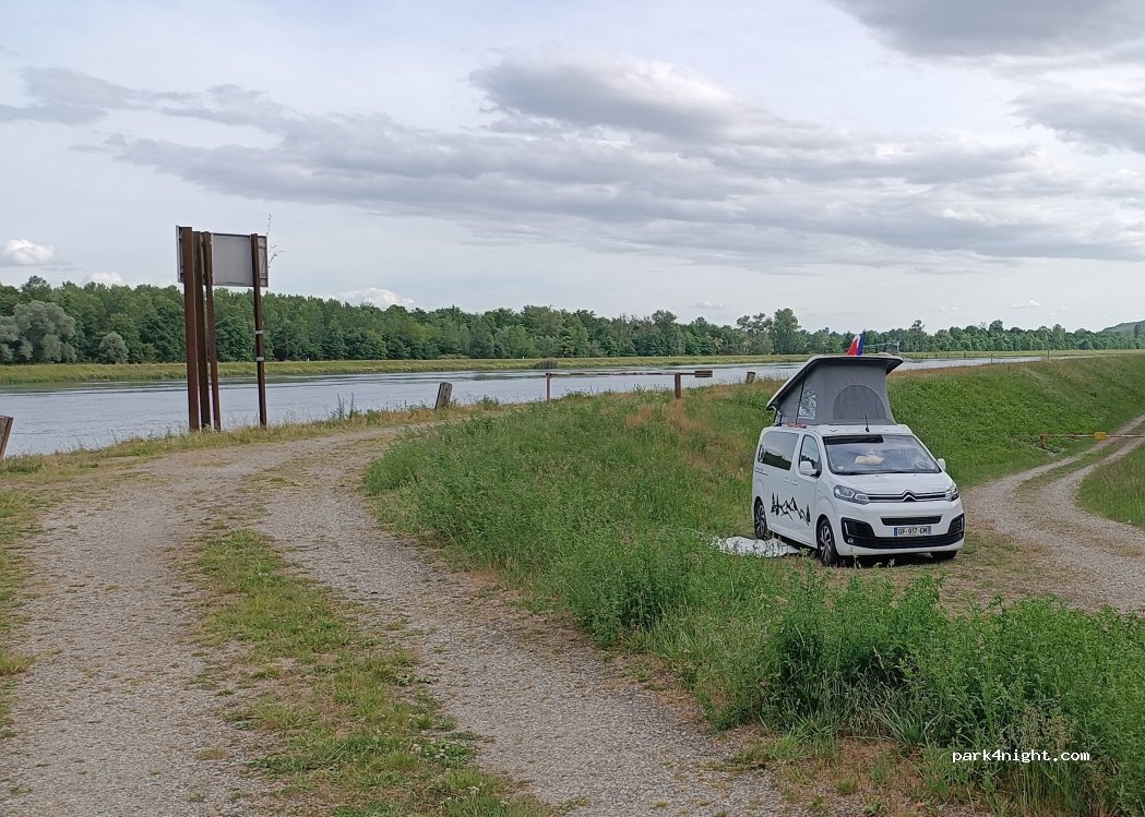 Small concrete square along the Rhine (50 m from the D 20). Ideal for a quiet night, punctuated by the passage of barges.