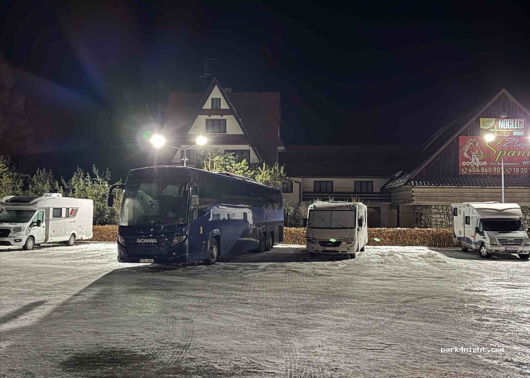 Parking gratuit. Beaucoup d'espace pour garer les camping-cars. Il y a un parking pour bus devant Chocholowskie Termy. Ils ferment la barrière à 23 heures pour que vous puissiez entrer par une autre porte de sortie (ne regardez pas les panneaux la nuit). Source d'eau à côté de l'entrée principale (disponible 22h/24 et 7j/7). Si vous souhaitez utiliser les toilettes, elles se trouvent à l'intérieur du bâtiment de Chocholowskie Termy, à côté du restaurant, et elles sont gratuites. Si vous souhaitez utiliser une douche, vous devez vous rendre aux piscines (payant). Pas de déversement d'eaux noires pour l'instant.