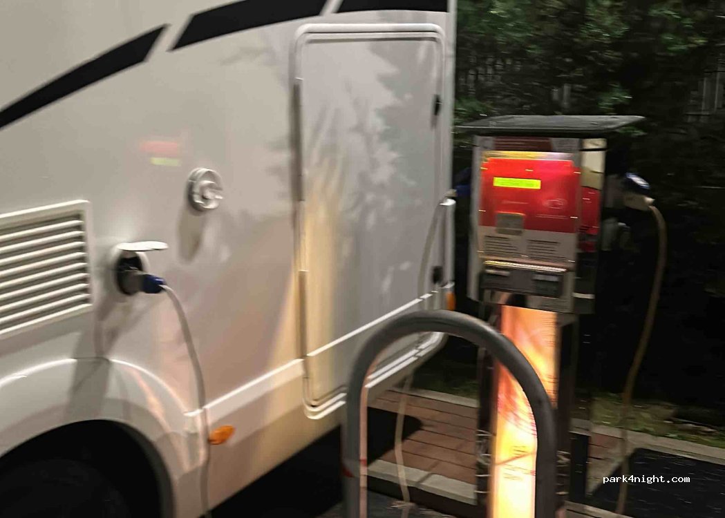 pour vider ma cassette, vider mes eaux grises, et remplir ma réserve d’eau propre, des emplacements avec électricité, et les emplacements étaient plutôt plat. Vous arrivez, vous appuyez, une carte sort, pour sortir une borne automatique, vous choisissez votre langue et vous suivez les instructions. la borne était « défaillante » la femme m’a donc rien fait payer! Merci donc encore une fois!