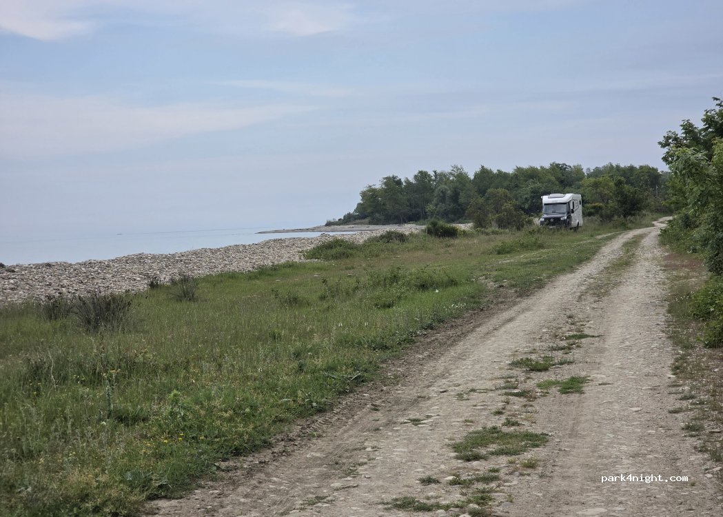 wer Ruhe sucht ist hier richtig mehrere Stellplätze entlang des Weges traumhafter Ausblick leider wie überall Müll Strand großer Kiesel etwas steil, möglicherweise für kleine Kinder Zugang schwierig aber Meer ist seicht, sandig, sauber und ruhig = Badewanne 4 Autos und 2 Traktoren 5 Kühe und 2 Delfine wir blieben 2 ruhige Nächte westliche Zufahrt sehr gut auch für WoMo östliche viele Äste