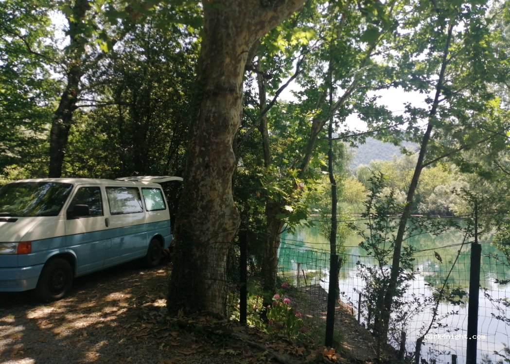 Parcheggio davanti ad un ristorante chiuso, ai margini di una stradina senza uscita in auto ma che può essere estesa camminando lungo il fiume. accanto, un centro nautico per canoa/kayak e un parco per bambini. ci siamo fermati lì durante il giorno per fare un picnic e atterrare davanti al fiume, è molto probabile che è possibile dormirci