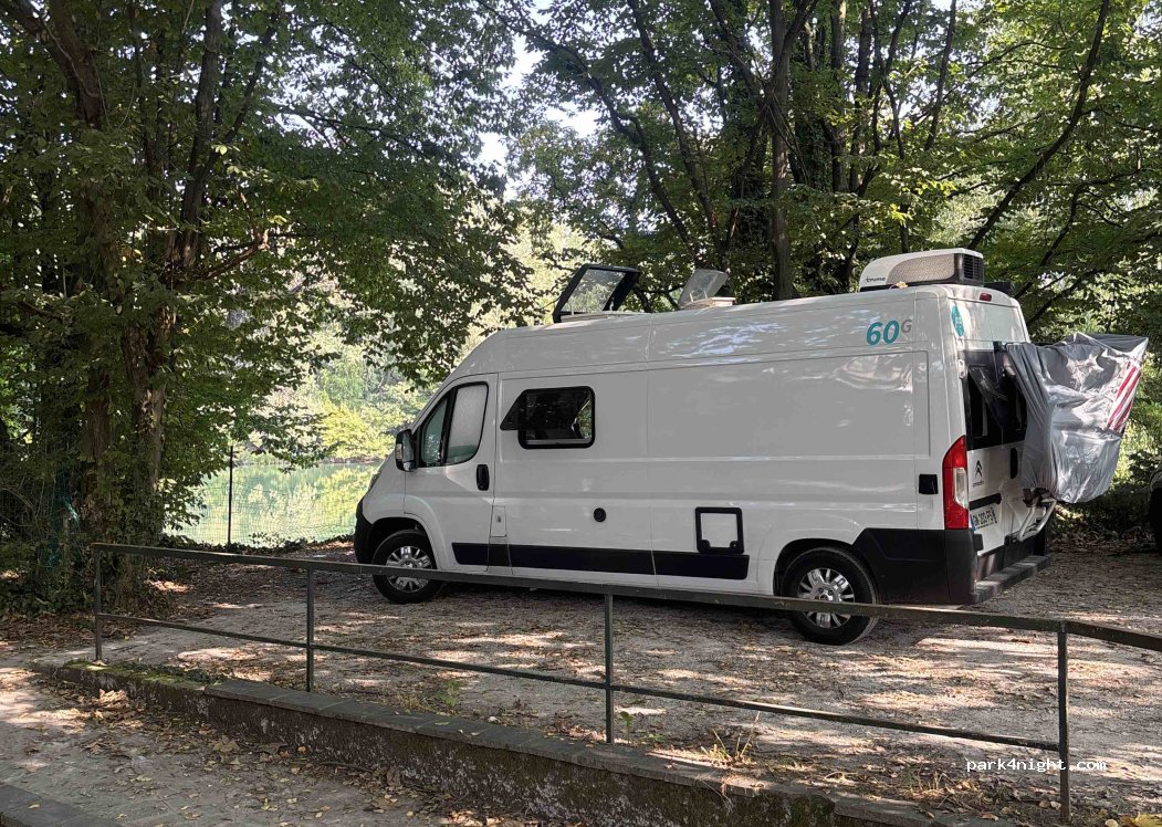 Très grand parking, spacieux et ombragé. de la place pour plusieurs véhicules. Emplacement à proximité de la ville de Brivio, le matin il commence à y avoir de l'activité et des passants à partir de 8h Il y a des grenouilles, mais nous avons surtout été gêné par les moustiques.