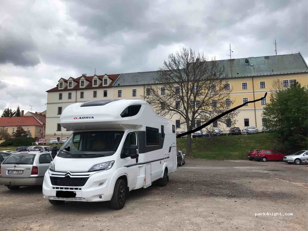 Grand parking autorisé jour/nuit. Idéal pour visiter JICIN, à quelques centaines de mètres du centre. Calme la nuit, plat.