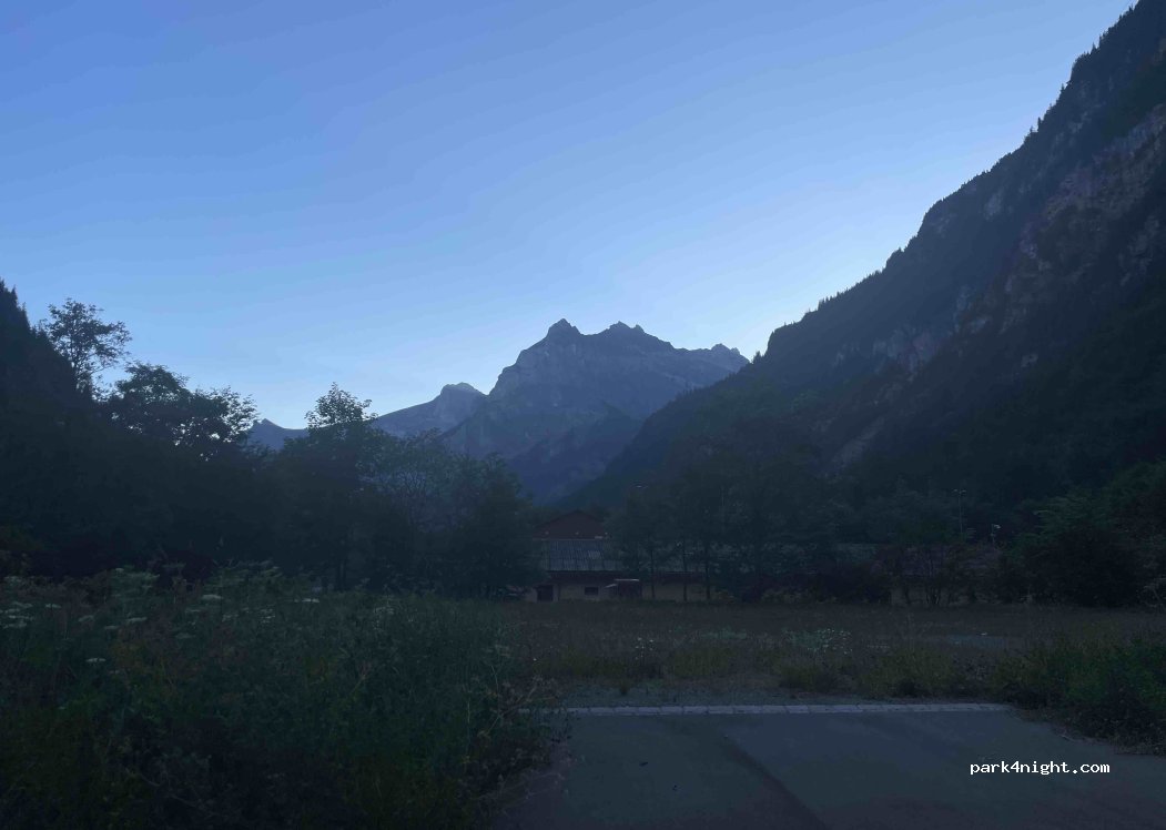 L’endroit est magnifique et très calme. Nous avons été bercés par la rivière proche. La place est grande et se situe au cœur des montagnes. Nous y sommes restés qu’une nuit mais totalement possible de faire plus. Il faut juste payer le parking mais c’est normal pour l’entretien. Nous avons payé via l’application Parkingpay.