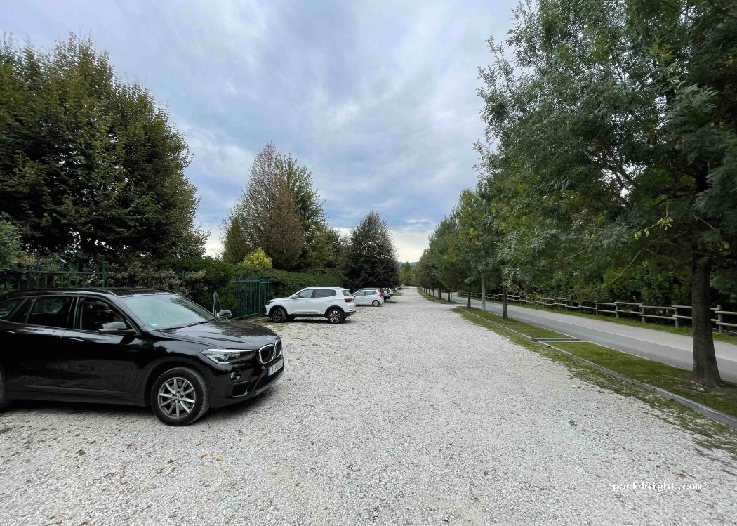 Le parking se trouve face à une salle où ont lieu des réceptions (mariages, soirées étudiantes ?). Nous y étions le soir du jeudi 8 septembre et nous entendions des jeunes parler fort départs de véhicules jusqu'à 1h/2h du matin. Si vous voulez vous éloigner du parking et de cette salle, vous devez vous stationner en légère pente.