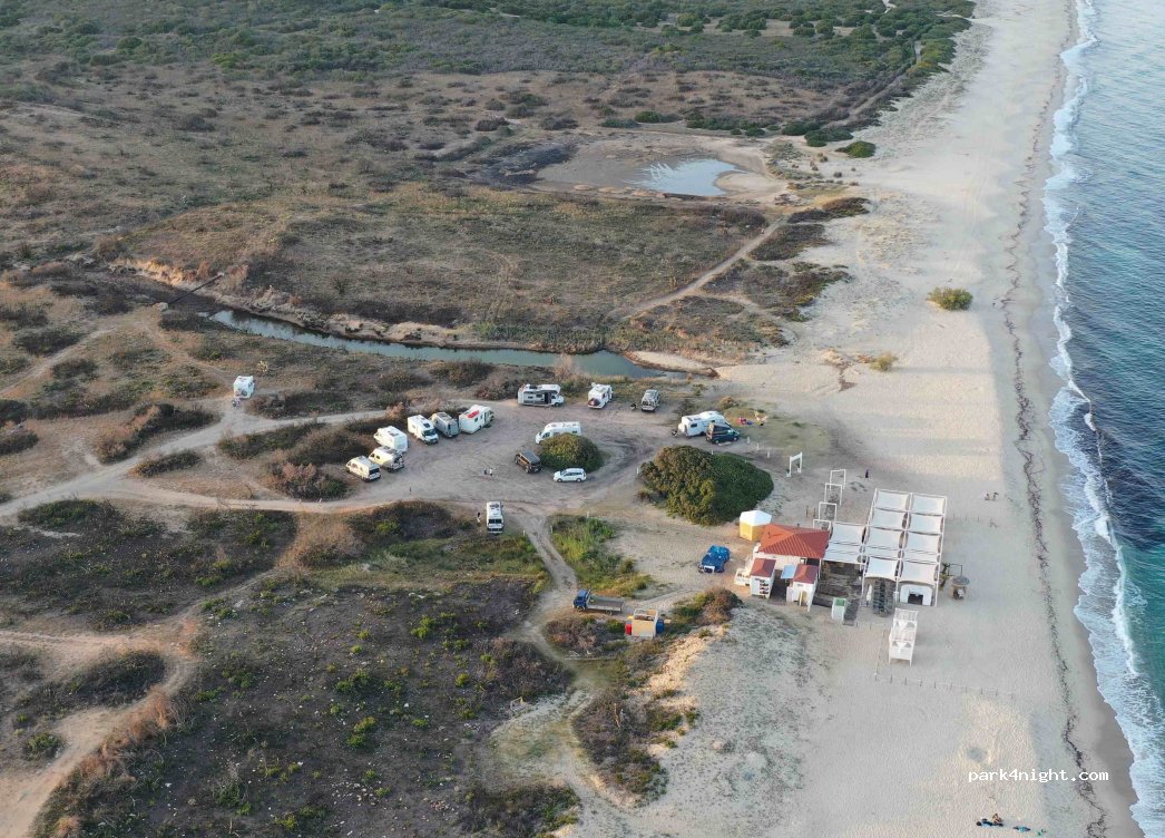 Parcheggio sterrato vicino al mare, con molti spazi adatti a camper di grandi dimensioni. Nessun divieto di pernottamento, valgono le normali regole del codice della strada: non è un campeggio! Il vicino chiosco in spiaggia ha una buona cucina.