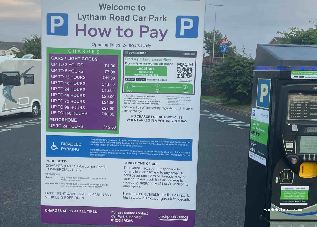 Nice stop over for the pleasure beach, which is only a short 15-20 min walk. Not the quietest - road and a railway line nearby (although trains didn’t run past 11pm or start again until 9am when i stayed Saturday night). Ground is not level at all. Blackpool council have recently permitted overnight sleeping with no camping behaviour. Good to see all vans adhering to the rules whilst there.