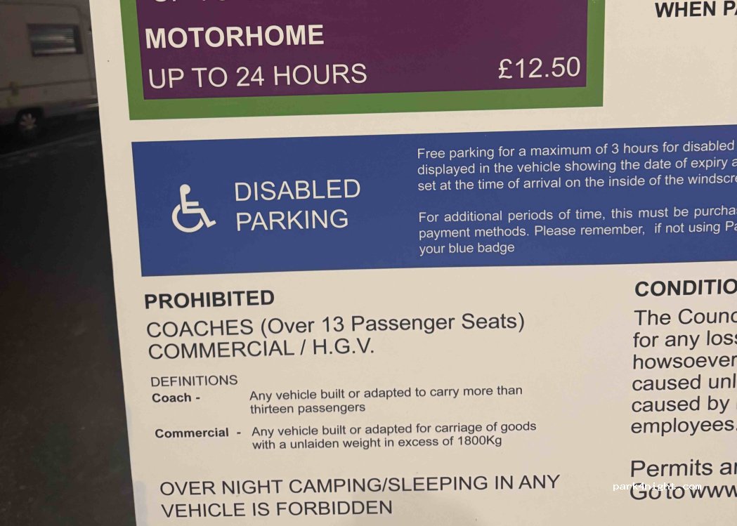A bit confusing as they offer Motorhome Parking at £12.50 for 24 hours but the signs say no Sleeping in any vehicle. The Car Park was full when I went and there were Vans there that looked like people were in. I went elsewhere. I’m not sure if it’s a generic council sign and they haven’t removed the sleeping restriction or it’s not enforced. Sleep at your own risk I suppose.