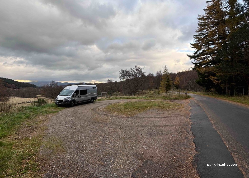 Brilliant little parkup 5 minutes from the spittal of Glenmuick. Ranger came by and gave me a leaflet explaining to park responsibly but was so friendly and happy for me to stay overnight. Stayed 2 nights no issues. very quiet. Also 5 bars 4G which is what sold it for me being a solo female!