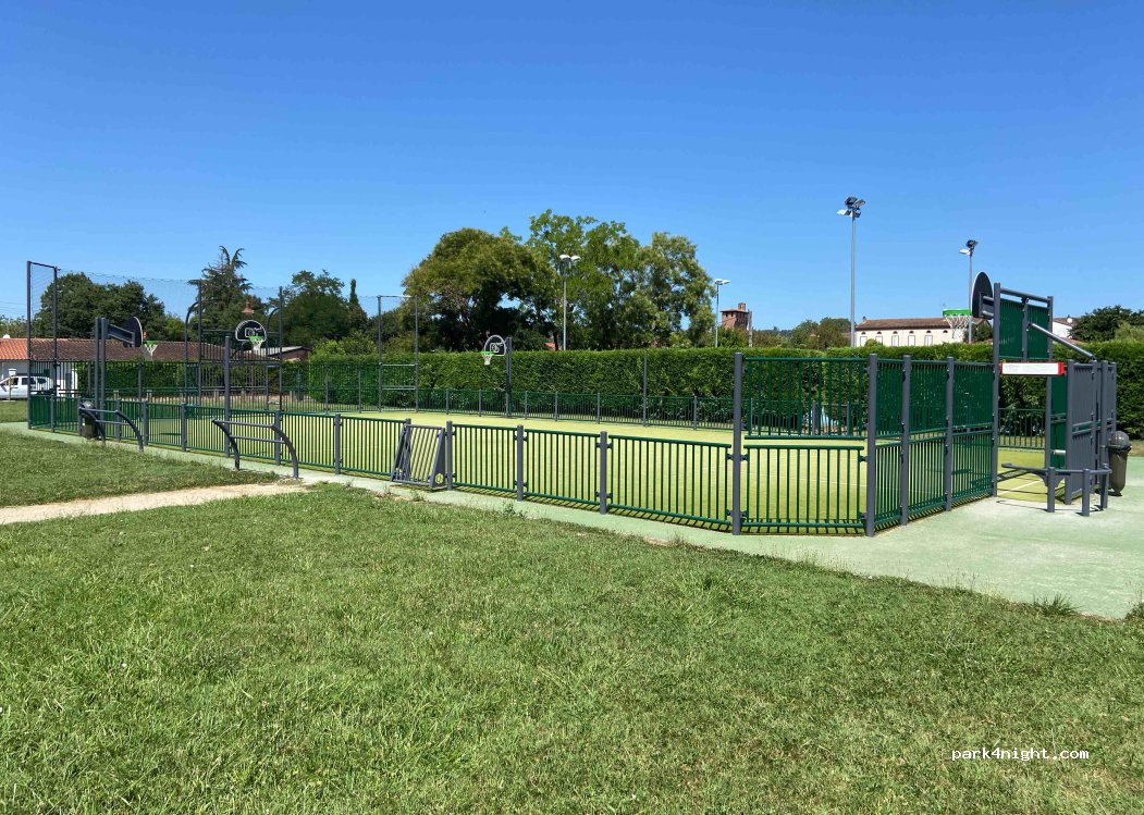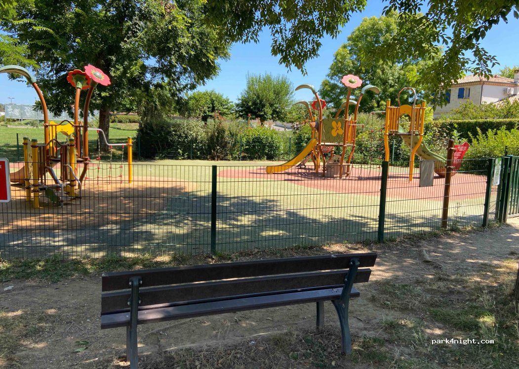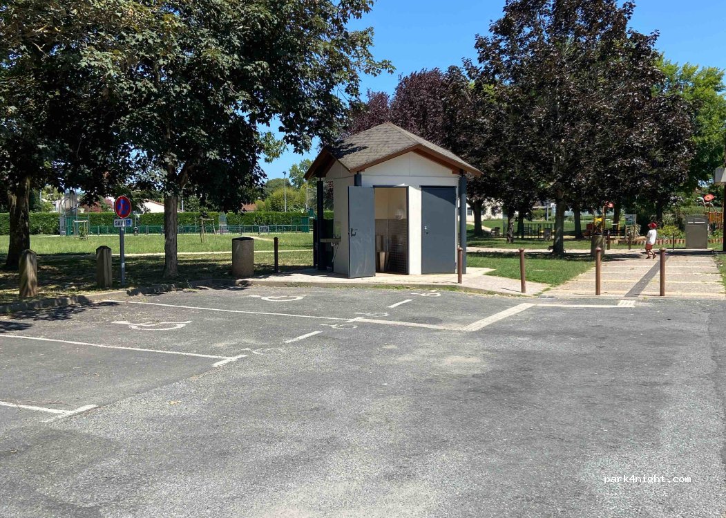 Aire de stationnement à côté de l'aire de pique-nique avec de l'herbe. Eau disponible mais sans possibilité de raccorder un tuyau au robinet. Stationnement jour et nuit autorisé. Seul