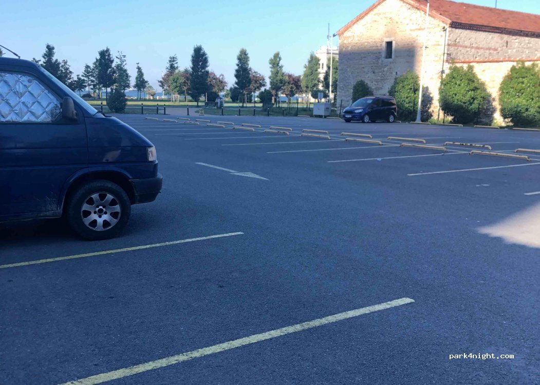 Parking agréable et calme en bord de mer, 30 minutes en transport du centre (comptez 10 minutes pour aller l'arrêt de bus le plus proche desservant le centre). Nous y avons passé 3 nuits. Un peu de circulation sur la route principale la nuit, sans grande nuisance pour nous. Parc, kiosque avec boissons et snack. WC pour 1 lire payable avec le crédit de la carte de transport (ouverts de 9h à 22h).