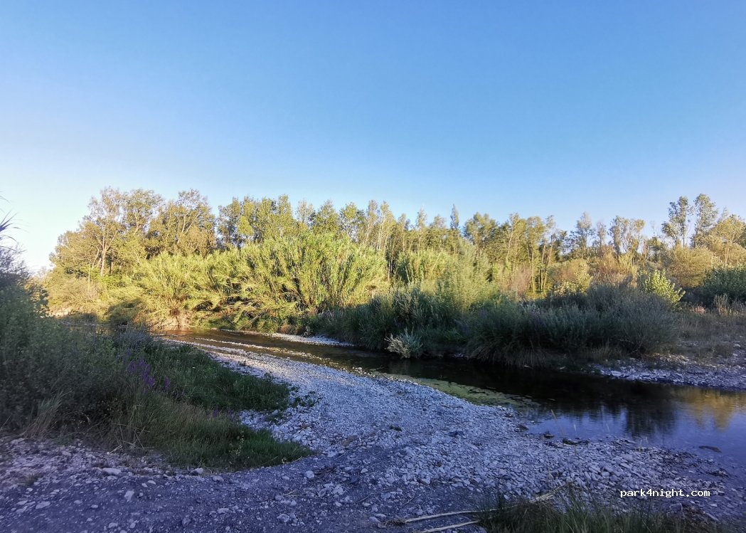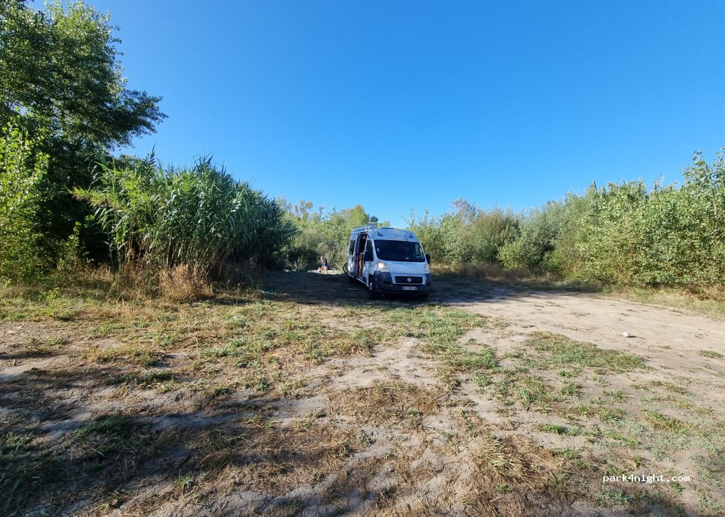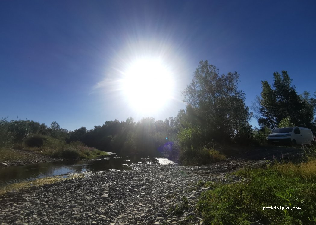 At the edge of a small river, quiet corner, accessible by car, van and I think motorhome as well. We were alone in the world, the river is shallow (about knee deep in some places) but allows you to cool off. Shaded corner. We spent the afternoon and night there, it was really great!