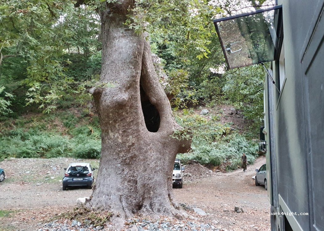 Schattiger Parkplatz von wo aus man gut die Vathras erkunden kann. Übernachten kein Problem.