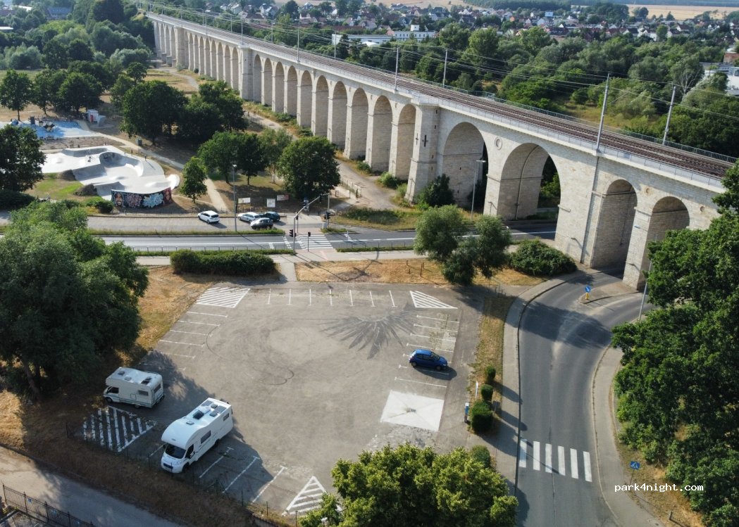 Darmowy parking ze stacją Camper Service. Ciekawa lokalizacja - przy wiadukcie kolejowym (najdłuższy w Europie). Super opcja na nockę w trasie.