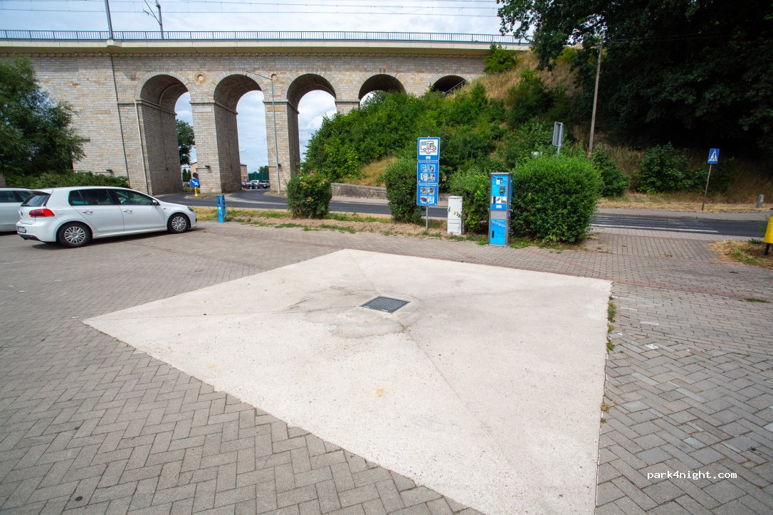 Spory ruch pociągów na wiadukcie i samochodów pod nim. Postój na jedną noc ze zwiedzaniem miasta, może być. Da się wytrzymać. Można zrobić serwis campera, sporo miejsca na parkingu.