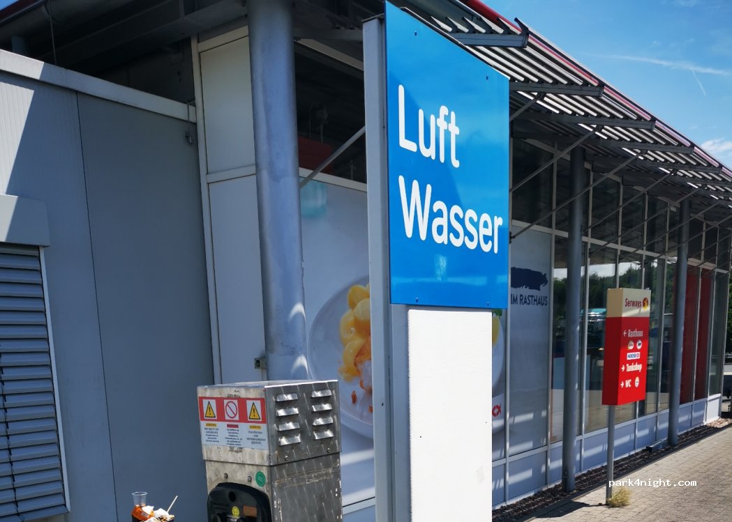 2 shower rooms with toilets in Serway building. €3 euro, unlimited water and clean. Pay at cafe counter and leave keys/ID while showering.
