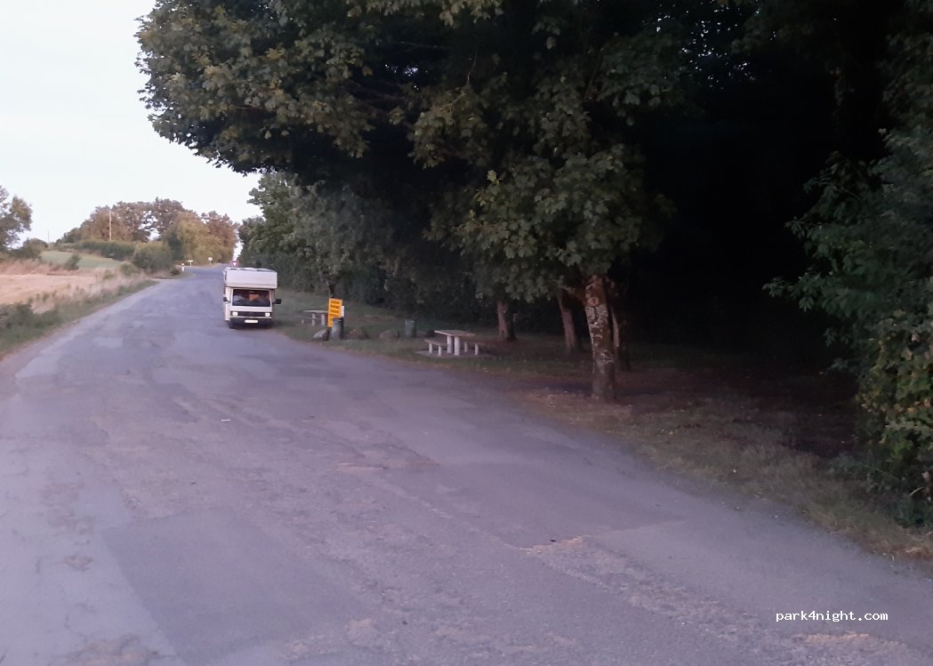 1/2 aire de repos avec tables, 1/2 séparée par des arbres Point de collecte des bouteilles et des canettes, endroit calme protégé de la rue par des arbres, 2 tables, avec un très grand panneau pour ne pas y laisser de déchets