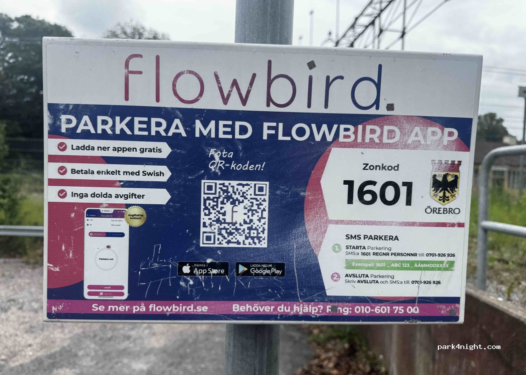 Parking, walking distance to downtown Örebro. Paid 8am-6pm - toll free 6pm-8am and on Saturdays and Sundays. Located directly at the railway. No restrictions visible.