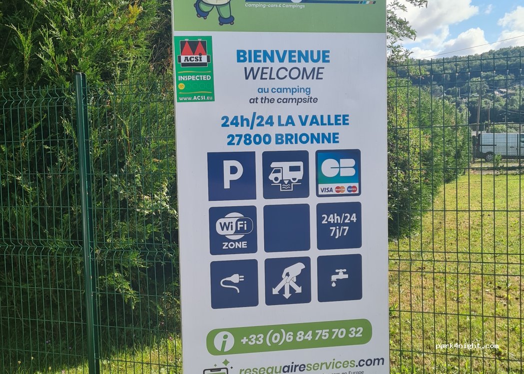 Borne en entrée. Coût raisonnable vu les services à dispo, à savoir bloc sanitaire, vidange des eaux. Proche d'un super market. Calme. Mieux vaut choisir les places avec gravier. Une affiche à l'entrée préconise les emplacements en gravier s'il pleut afin d'éviter de s'enliser. Je conseille ce site. Merci à la commune.