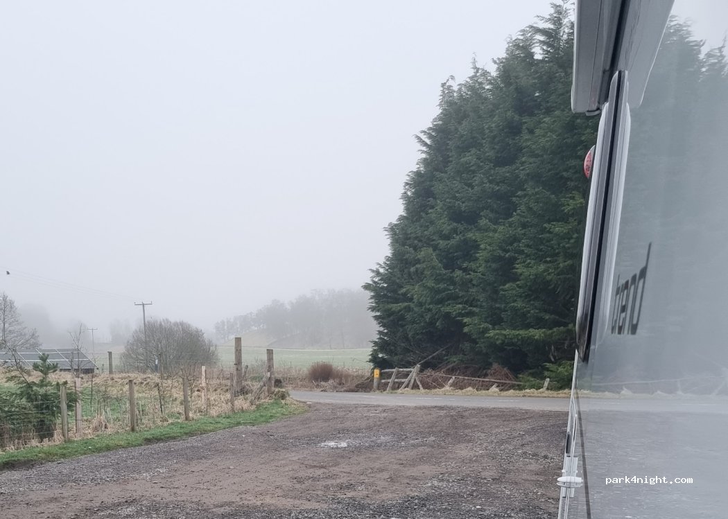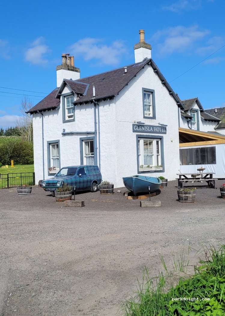 Parking sur le sentier Cateran. Le parking est une aire en dur appartenant à l'hôtel, en face d'un ruisseau étroit traversé par une passerelle. Il peut accueillir plusieurs camping-cars. Possibilité de se garer sur le grand terrain attenant. Aucune limite de taille n'est imposée. L'hôtel est ouvert 24h/24 et 7j/7 et les campeurs sont invités à utiliser les toilettes situées à l'entrée principale. 10 £ par nuit ; bar/restaurant ouvert du mercredi au dimanche à partir de 11h. Il est conseillé de réserver une table, car le bar peut être très fréquenté le week-end. C'est un endroit idéal pour une promenade dans un paysage magnifique.