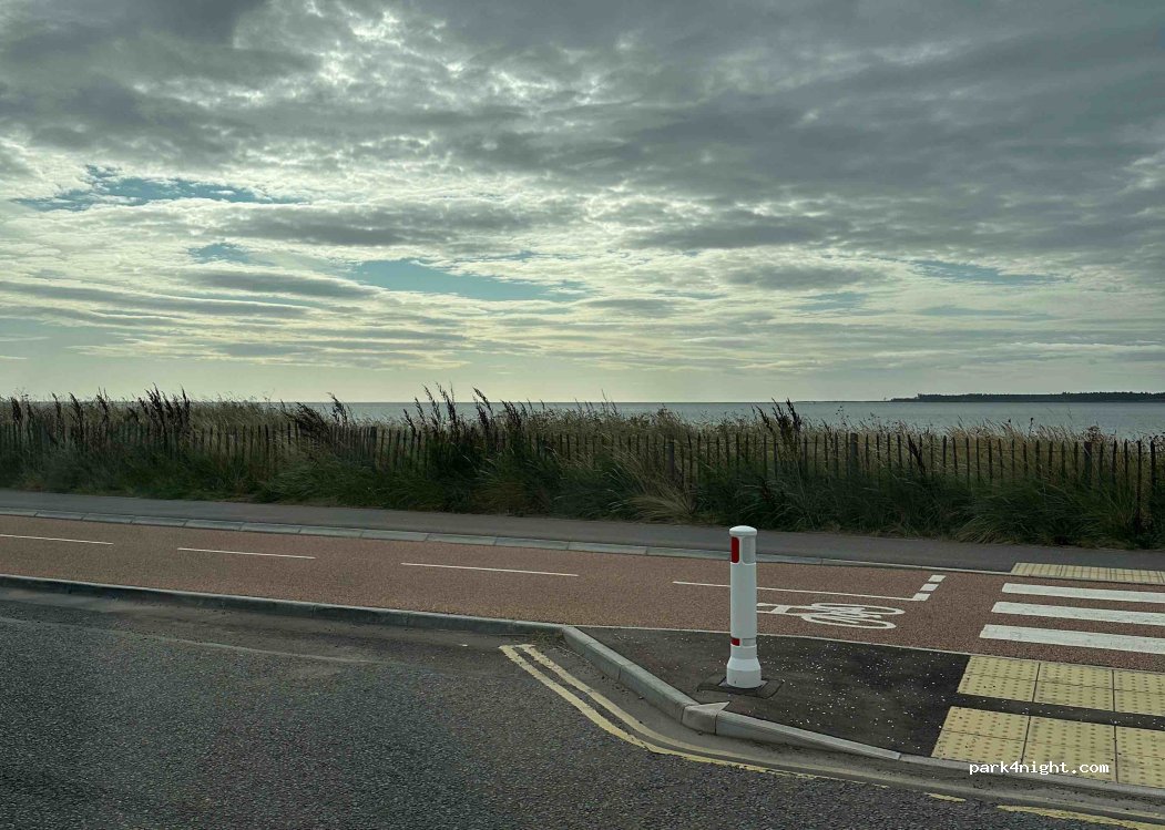 Stayed overnight for 1 night - very little traffic, a few joggers, cyclists, dog-walkers. No signs to indicate any restrictions or payments. No facilities. Parked adjacent to the park, quite near to the tennis courts. Pleasant aspect - sand dunes and nice views. Good shops and bars, and railway station all about 10 mins walk. Would use again.