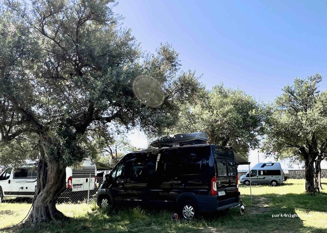 Great spot! You can park your motorhome underneath the olive trees. The hills on one side, the beach on the other side. Warm welcome, peaceful and quite place to camp and to relax. We paid €20 per night. Facilities are clean and nice.