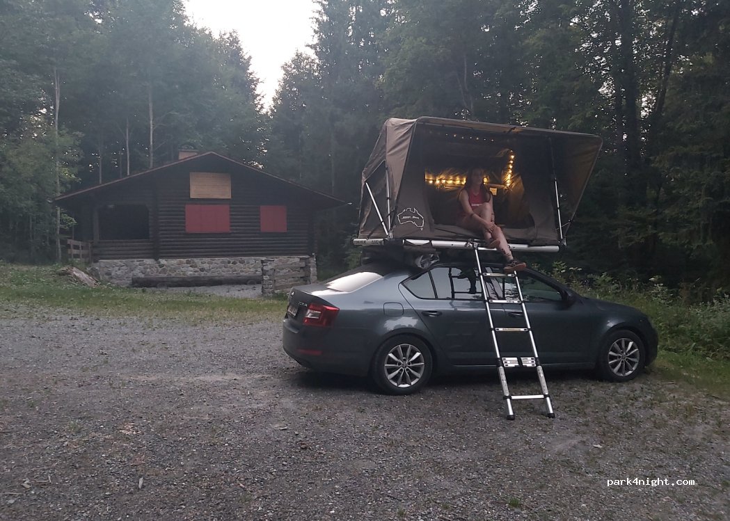Parken neben einer Schutzhütte, ziemlich ruhig und gut für eine Nacht Wir hören abends nur ein wenig Autos in der Ferne und morgens Wanderer, aber nichts störendes Gelände nicht 100% flach