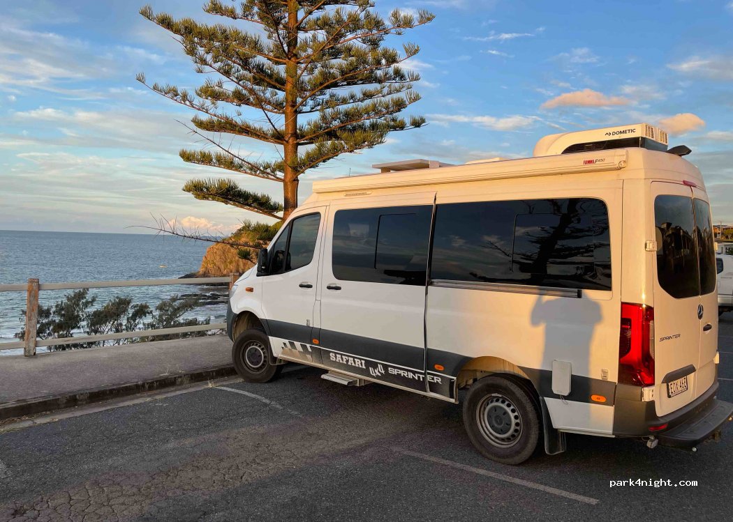 Car park on headland high above the beach. Quiet and just far enough away from the small town area. Beautiful morning sunrise awaits. Don’t stay in the car park on the beach.
