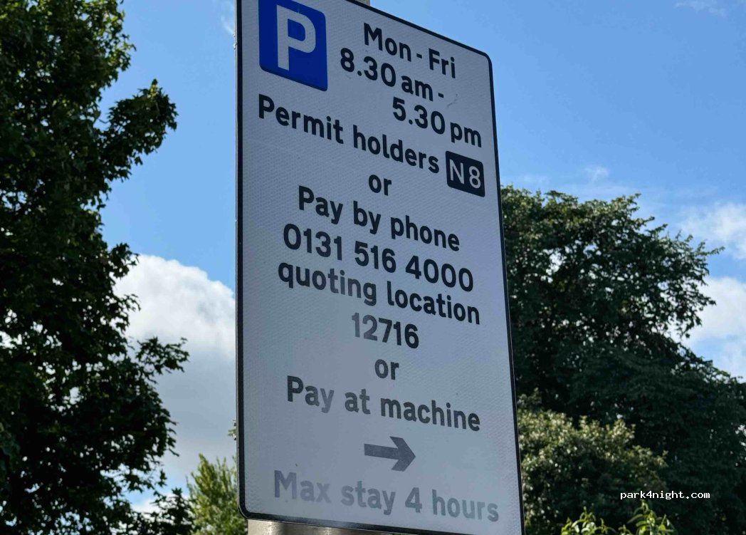 Stationnement payant (3.8£/heure avec max 4h ou 6h selon les emplacements, gratuit la nuit et pas de panneaux interdisant le stationnement de nuit). Trafic important et continu Eau fraîche (top UP TAP) dans le parc Largeur ok pour un campervan 1h à pied du parc Holyrood ou du château (possibilité bus)