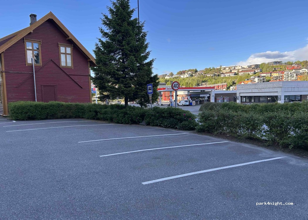 Parking space in a very central location right at the entrance to the town. The area is paved but not level. Power connection is available. Directly across the street (to the right of the Esso gas station) is the tourist information office, where the showers including toilet and washing machine with dryer are located. There is a 40 NOK fee for getting the dor code for the washing machine and dryer. And additional 40NOK for acces code to the showers.