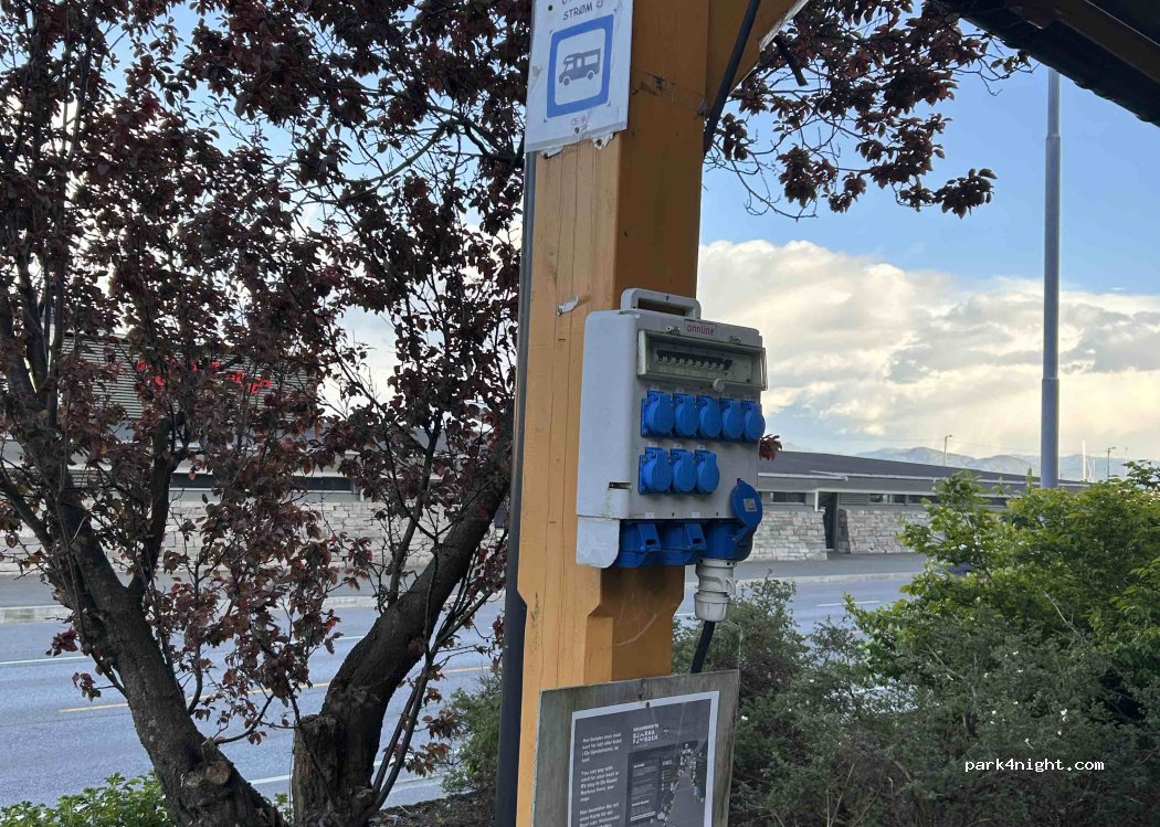 Place de parking dans un emplacement très central juste à l'entrée de la ville. La zone est pavée mais pas de niveau. La connexion électrique est disponible. Directement de l'autre côté de la rue (à droite de la station-service Esso) se trouve le bureau d'information touristique, où se trouvent les douches, y compris les toilettes et la machine à laver avec sèche-linge. Le chemin vers l'eau est court et il y a des bancs sur le rivage pour profiter de la belle vue. L'endroit est bien pour une nuit.