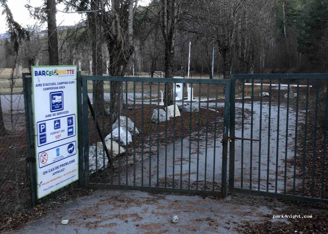 Après avoir roulé depuis Nice ( 4h) pour découvrir Barcelonnette quelle déception de trouver la barrière de l'aire fermée . Nous nous sommes donc stationnés sur le parking des anciennes casernes du 11eme BCA qui sont désaffectées. Pas d'interdiction. Pour une nuit c'est très bien.