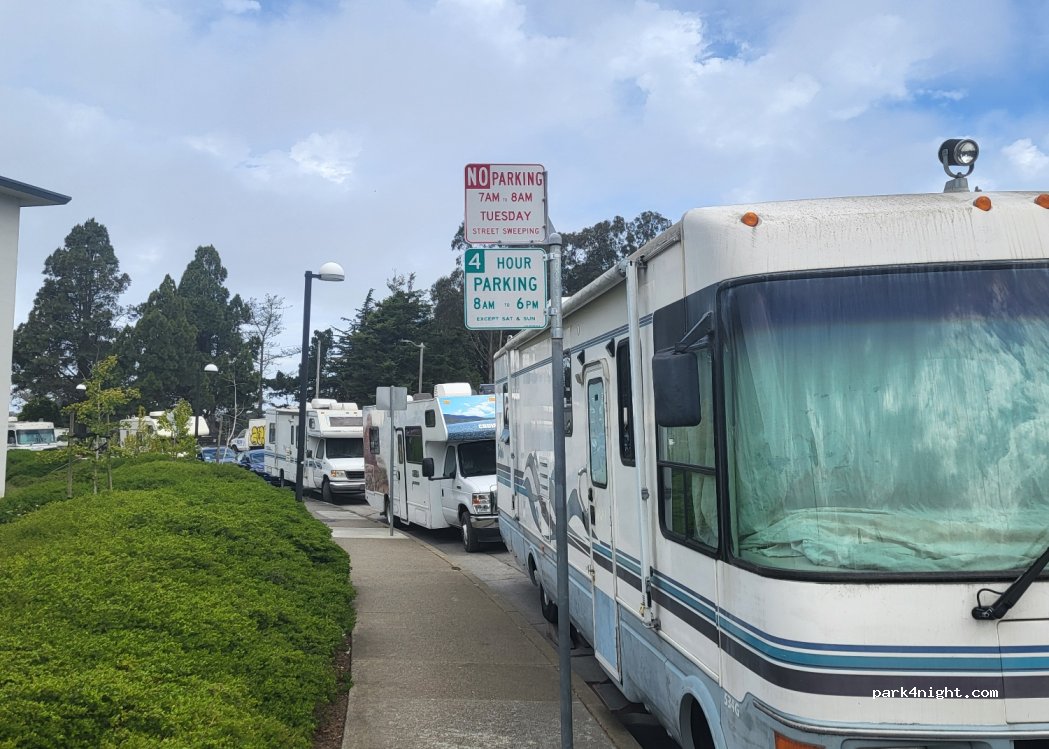 Parking on the street. Close to the Stonestown Tram stop (15 min on foot). The only space we found near San Franciasco to leave the vehicle for free. Pay attention to signs with street cleaning days. Lots of parked RVs.