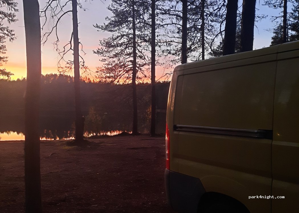 Rauhallinen parkkipaikka yöksi heti tien vieressä, ettei tule ylimääräistä ajoa. Mäntyjen siimeksessä muutama autopaikka. Kirkasvetisen järven ympäri menee kävelypolku.