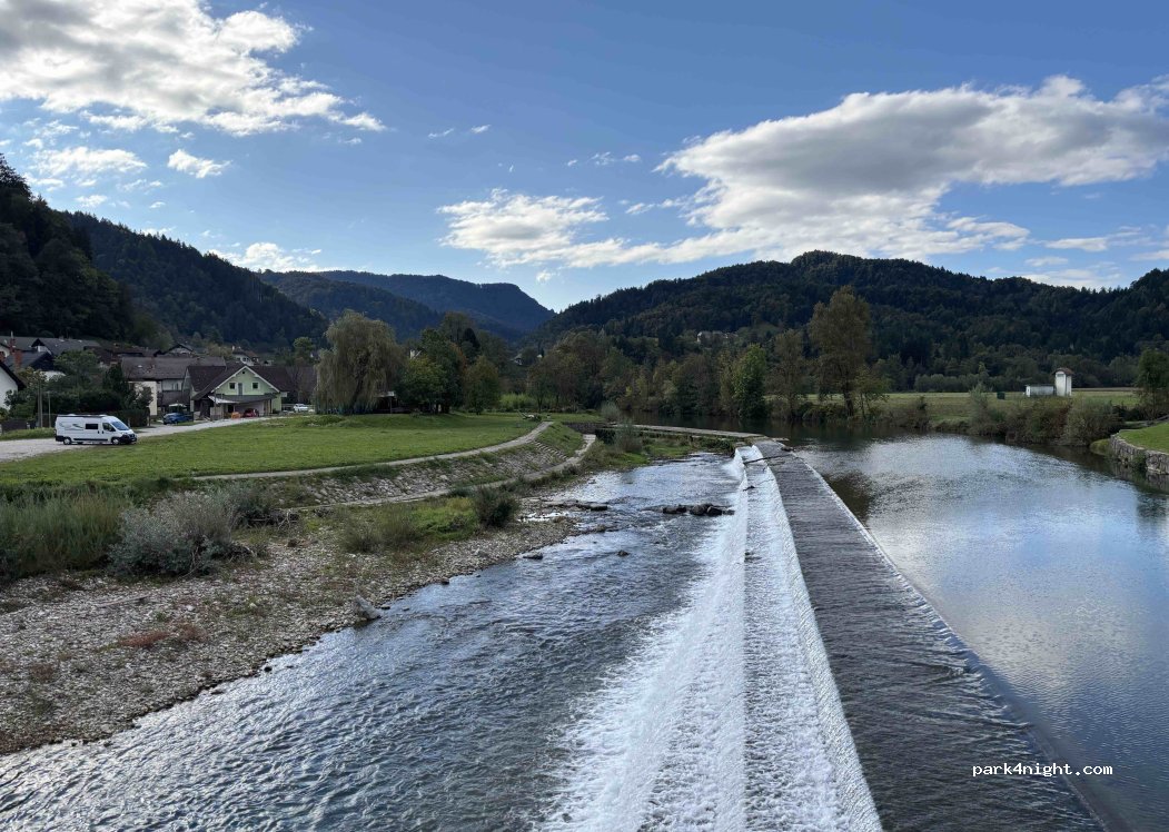 Parking très calme, dans la verdure, à proximité de la rivière! Petit bar sympa et pas cher à 2 pas! A 5’ du centre de skofja