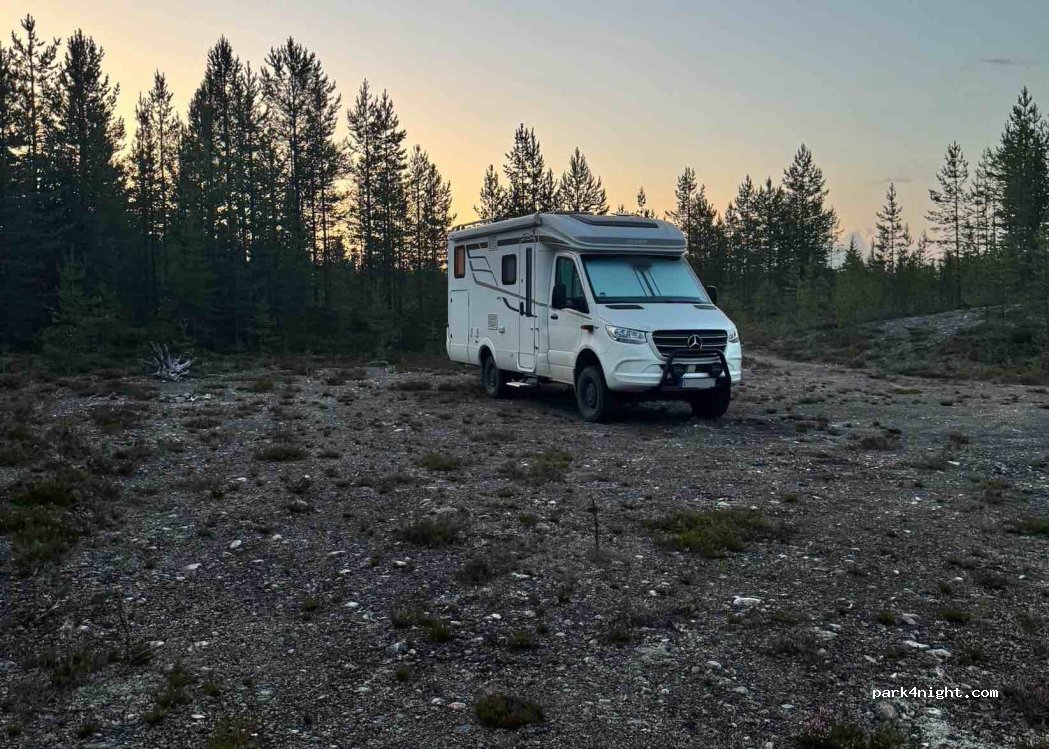 Large open space on a gravel road to Julma-ölkky. Several parking options, some for 4x4. sand and gravel. Surrounded by forest. 300 m to a lake. Absolutely quiet at night, some traffic during the day, but hardly noticeable depending on the space. Depending on the vehicle height and not visible on the marked space. Few shaded areas.