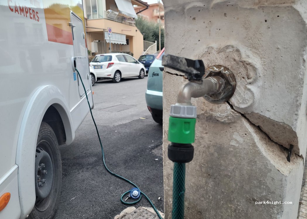 Al centro del paese su un'ampia strada dove ci si può fermare per un breve periodo senza problemi. Fontana di acqua dolce con rubinetto. Gratuito.