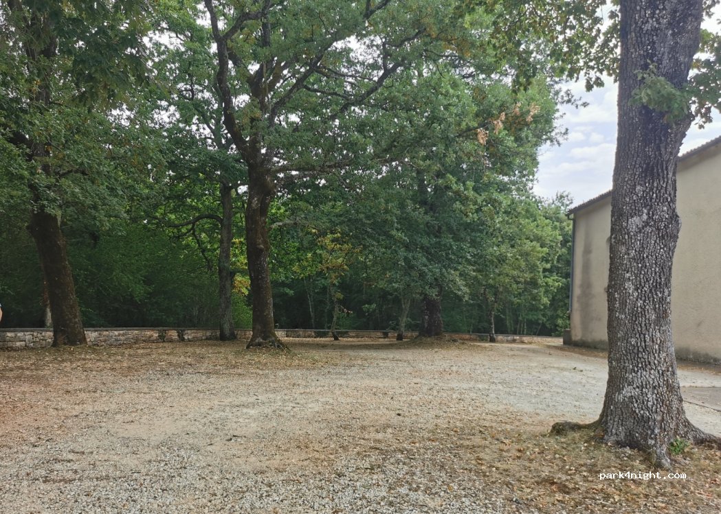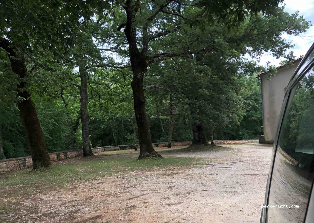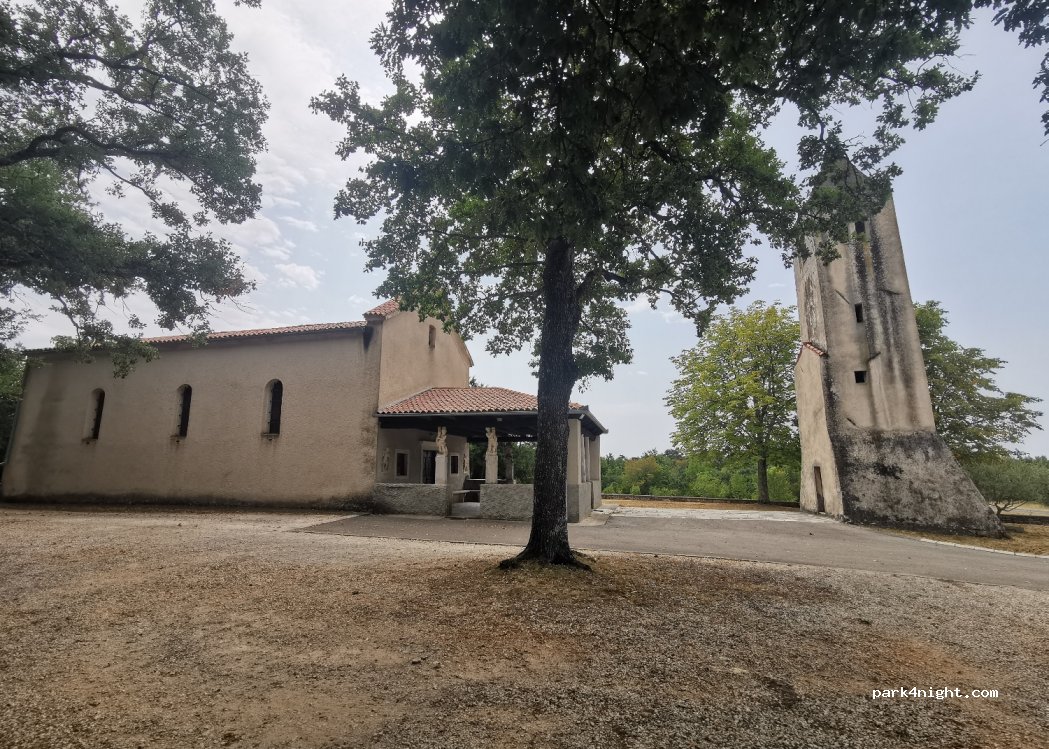 Beautiful parking with trees of this small church, unfortunately it was closed and we didn't visit it, we stopped for a few hours in the afternoon and sheltered in the shade of the trees that were tall enough not to touch the camper. The church is on the main road (state, not ipsilon) which leads from Žminj (Žminj) to Pula and is a few kilometers from Žminj.