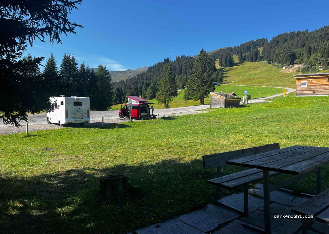 Toller Parkplatz für 25€ die Nacht. Wenn man die Brambrüesch Alm hochläuft, ca.15 min.hat man einen atemberaubenden Panoramablick über die Alpen. Die Toiletten sind auch nachts geöffnet und sehr sauber. Perfekt zum wandern, biken oder einfach nur relaxen. Man kann einen kleinen RundMoorweg hier gehen, es gibt viele Bänke zum sitzen, eine Leseecke an einem kleinen Teich steht zur Verfügung und Holz zum Feuer machen steht zur Verfügung. Es war mit unseren 6,5m langen Van eine problemlose und grandiose Fahrt nach oben, wir hatten kaum Gegenverkehr, gab genügend Buchten zum ausweichen und der Blick wurde von Kurve zu Kurve besser. Sehr zu empfehlen - Daumen nach oben!