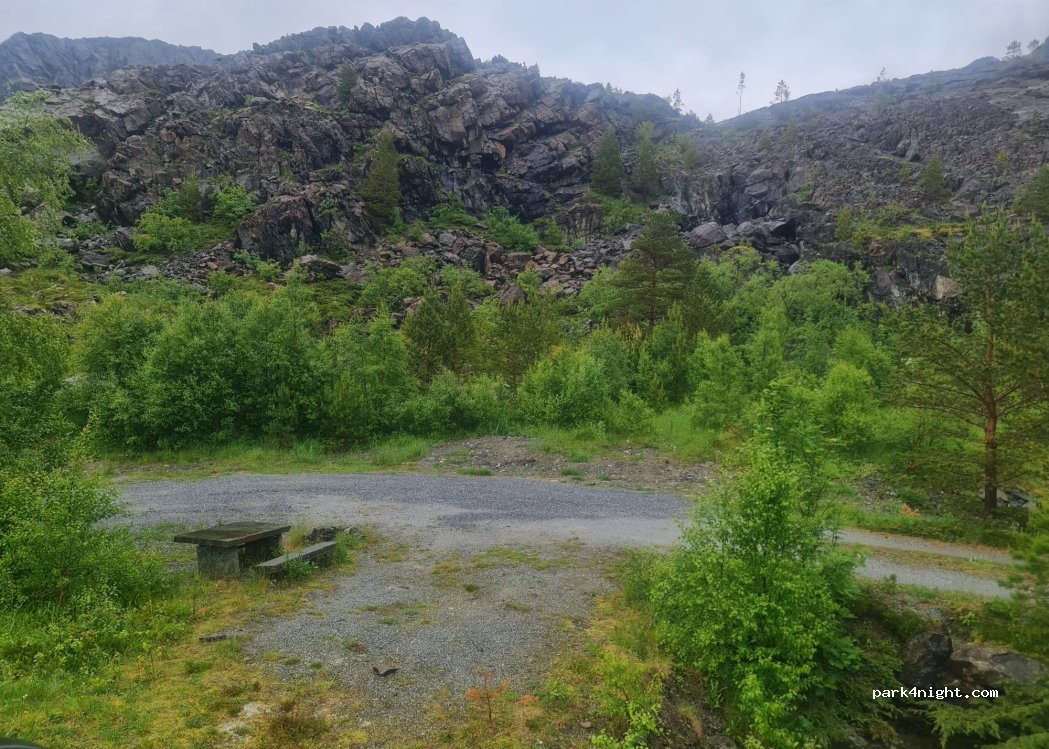 Plek net naast de weg op weg naar de Torghattenrots. Zeker OK voor 1 nacht. 's Nachts is hier weinig verkeer.