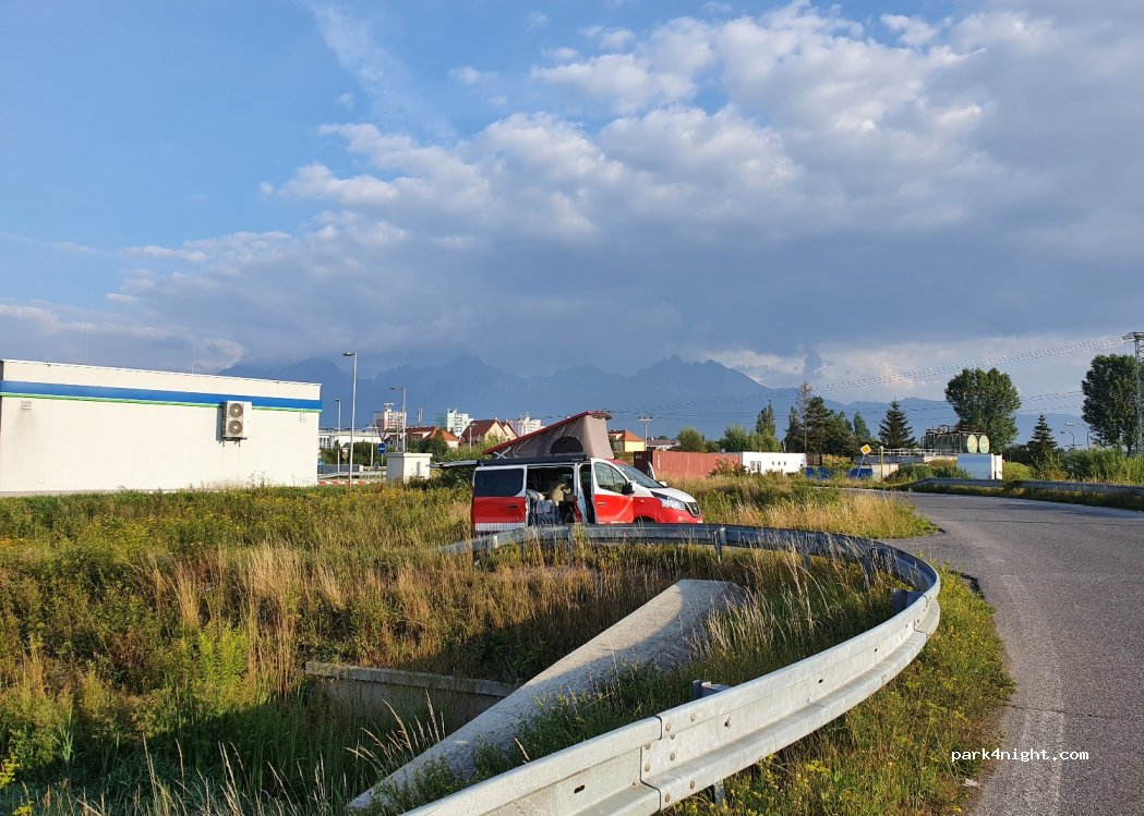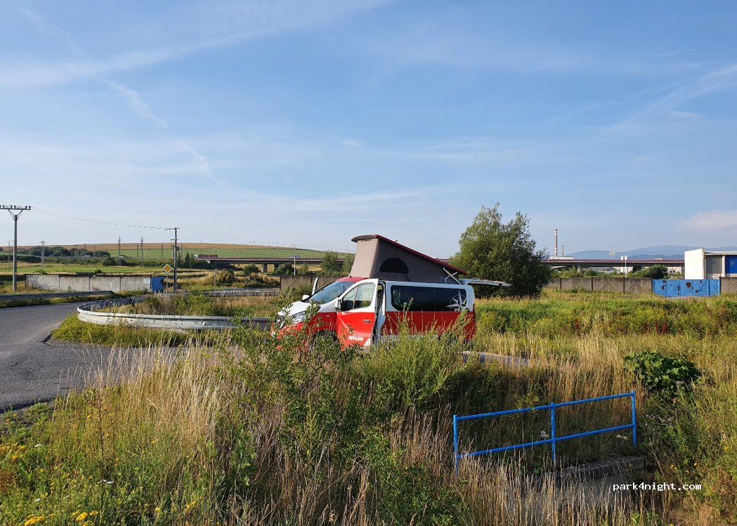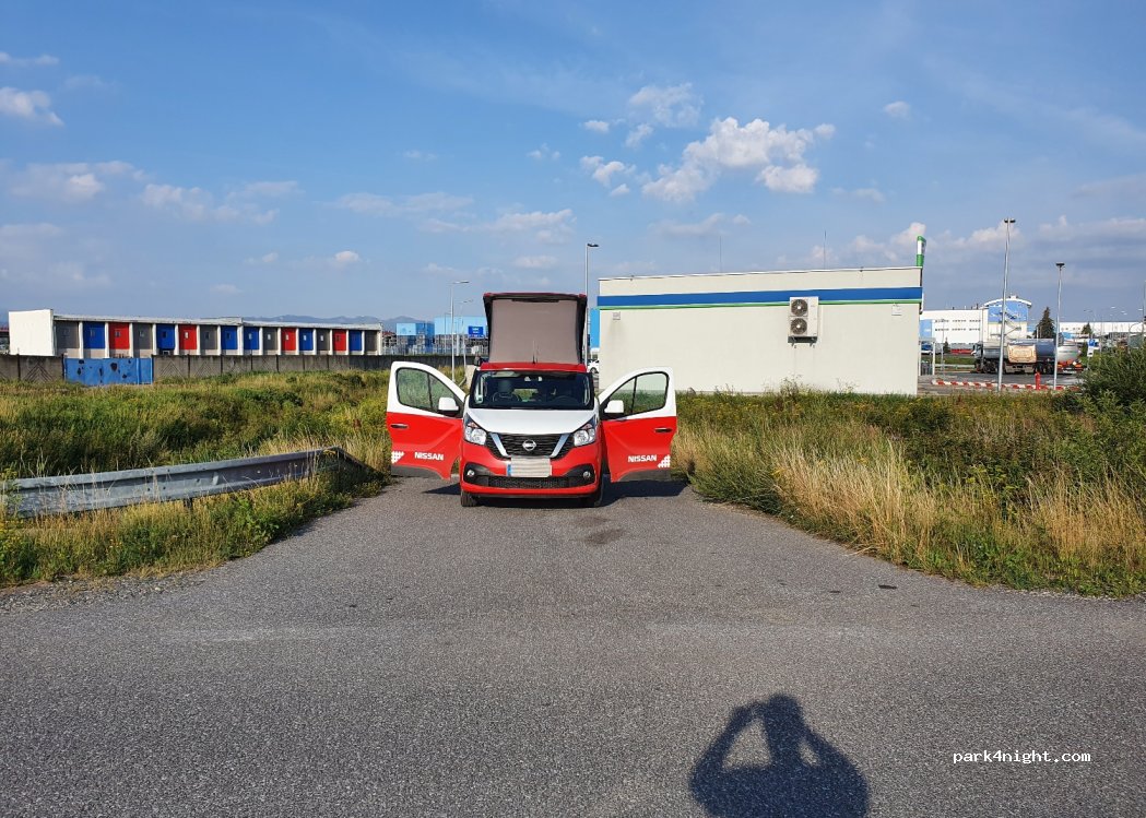 Small paved area - big enough for a parking space. Not a nice place but good for one night. The surface is a bit sloping, which didn't bother us. Positive is the proximity to the highway and the gas station with all services in the immediate vicinity.